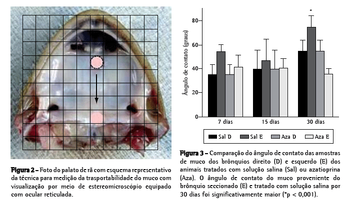 O presente estudo foi aprovado pela Comissão de Ética para Análise de Projetos de Pesquisa da Faculdade de Medicina da Universidade de São Paulo. Utilizamos 36 ratos machos Wistar-Furth, com peso aproximado de 300 g, conforme as normas internacionais que regem a pesquisa com animais de laboratório.(7) Todos os animais foram submetidos ao mesmo procedimento cirúrgico, sendo distribuídos aleatoriamente em dois grupos: o grupo Aza (n = 18), tratado diariamente com azatioprina, e o grupo Sal (n = 18), tratado diariamente com solução salina. Seis animais de cada grupo foram sacrificados após 7, 15 e 30 dias de terapia, e as análises de transportabilidade do muco in vitro, velocidade de TMC in situ e ângulo de contato do muco foram realizadas.