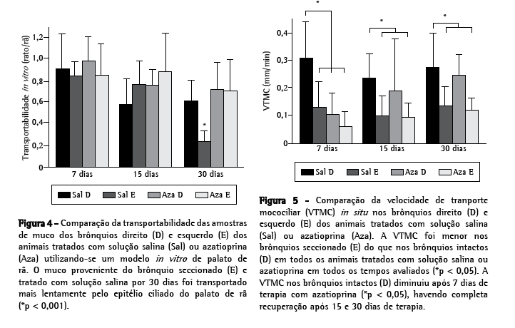 Nos animais que receberam azatioprina, constatou-se que ela reduziu a velocidade de TMC no grupo sacrificado após 7 dias de terapia tanto no lado direito intacto quanto no lado esquerdo operado. Ao longo do tempo, há evidente recuperação da velocidade de TMC nos lados direito e esquerdo, indicando que a velocidade de TMC é afetada pela azatioprina apenas no período inicial de até 7 dias de terapia. Esse mecanismo deve decorrer do fato de seu efeito diminuir a atividade celular e atingir as células ciliadas, alterando sua função. Com o tempo, a recuperação da função das células ciliadas no grupo que recebeu azatioprina se dá provavelmente por dois motivos: a cicatrização brônquica e a melhora na formação e nas propriedades do muco, que levam ao aumento da velocidade de TMC. Muitos protocolos de imunossupressão incluem a azatioprina como droga de administração pré-operatória.(19) Com base nos resultados do presente trabalho, sugerimos que essa indicação, assim como seu tempo de manutenção pós-transplante, possa ser objeto de diversos outros estudos experimentais.