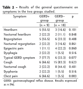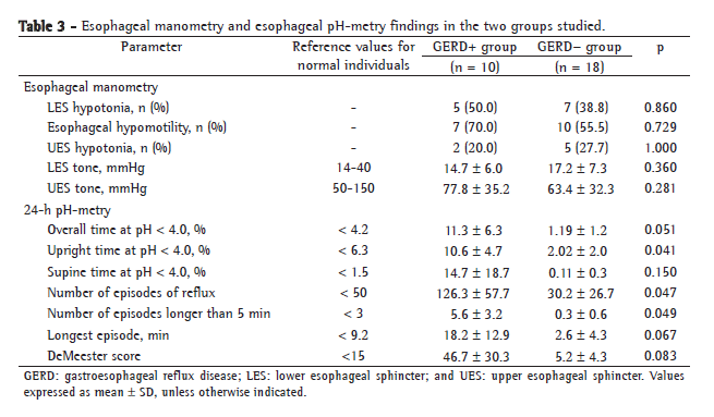 The statistical analysis included the comparison of data related to the patients with GERD (abnormal pH-metry) and those without GERD (normal pH-metry). The chi-square test and the Student's t-test were used. The level of significance was set at 5%.