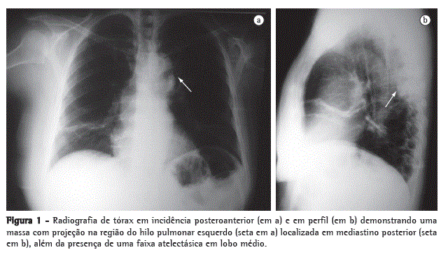 A radiografia de tórax evidenciou uma massa em topografia de mediastino posterior, que foi confirmada no pré-operatório por TC de tórax, na qual foi identificada uma massa heterogênea com calcificação densa em topografia de goteira costovertebral esquerda (Figuras 1 e 2).