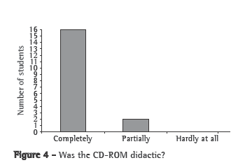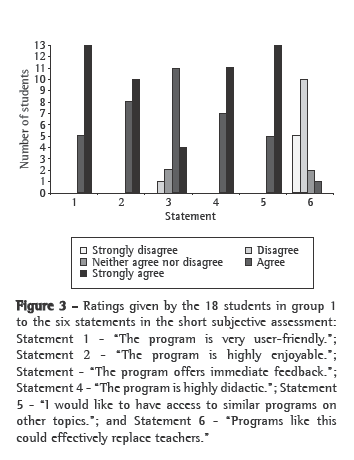 The short subjective assessment format carried out immediately after the study by computer revealed a great majority of satisfactory answers to the questions on whether the program is user-friendly, pleasant, whether it offered immediate feedback, whether it is didactic, and whether the students would like to have programs on other topics. To these, we added a thought-provoking question. We wondered what this generation of students thought about the feasibility of replacing teachers with computer programs, although that is certainly not the principal argument of this study. We think that the role of the teacher is not to merely impart information. In our opinion, imparting experience and setting an example are functions that cannot be replaced. From the tests results, it seems that this is also the point of view of the students. A similar response was found by another author.(22)