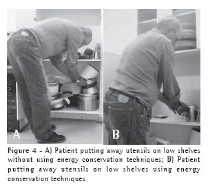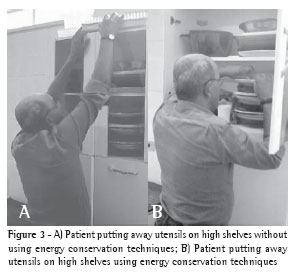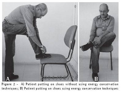 According to some authors,(22) the objectives of energy conservation and training of ADLs are the following: training diaphragmatic breathing, first at rest so that the patient acquires the perception of the respiratory movements during inspiration and expiration and, later on, during the performance of the tasks, avoiding the brief periods of apnea than can occur; training the upper limbs, with the objective of increasing exercise tolerance; programming activities with distinct levels of demand, beginning with light, slow activities that require less energy expenditure, such as personal hygiene activities performed while sitting, with upper limb support (brushing teeth, combing hair, shaving, face washing, applying makeup), followed by those performed while sitting without upper limb support (shaving armpits and showering); simplifying the performance of some tasks by adapting the environment (elevating the toilet seat and installing support bars/hand rails in the bathroom) or by using assistive technology (long-handled shoe horns, long-handled combs, walkers with seats and bags, etc.); eliminating unnecessary activities, such as dish drying (using a drain rack instead), drying after bathing (using a plush robe) and shoe tying (wearing slip-on shoes); informing patients of the importance of asking for help from family members, caregivers or others, when necessary; organizing time, planning the day/week, calculating the time spent in the performance of activities/the time needed for rest and encouraging the use of organizers; organizing the environment so that the materials that are going to be used by the patient are within reach, that is, between the scapular and pelvic girdles, reducing the need for broad movements of the upper limbs without support, as well as avoiding bending; educating the patient regarding the most appropriate postures for the performance of each task, adapting the way in which the activities are performed (using a table, counter, or even the bathroom basin, to support the arms, as well as eliminating the need to bend over.