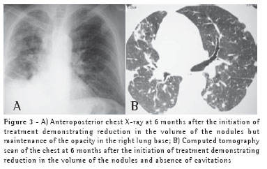Chest X-ray revealed multiple nodules disseminated throughout both lungs (more prominent on the right side), accompanied by opacification of the right costophrenic sulcus. A computed tomography scan of the chest confirmed the presence of nodules of various sizes, some of which presented cavitation (Figure 2). The laboratory test results were normal, and the serology for human immunodeficiency virus was negative, as were the results of two blood cultures.