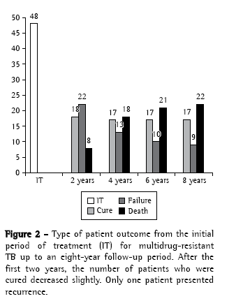 In Brazil, a cohort study that analyzed cases of MDR-TB reported between 2000 and 2004 showed that the effectiveness of the treatment was 65% in the final phase of the study.­(11) Our percentage of cure was 34% (considering 48 patients and 2 cases of noncompliance), and all cures occurred during the first 2 years of treatment. Since the city of Rio de Janeiro has one of the highest incidences of TB and MDR-TB in the country, the lower percentage of cure reported can be related to the greater severity of the cases. The greater association between hospitalization and death was obvious. Frequent relapses, such as those that occurred in the initial phase of the treatment for TB, are related to irregular drug intake, which results in apparent cure with the maintenance of a significant number of persistent bacilli that develop again, already exhibiting resistance.(25)