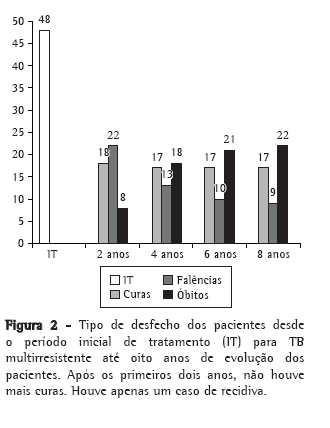 No Brasil, um estudo de coorte que analisou pacientes com TBMR, notificados entre 2000 e 2004, mostrou que a efetividade do tratamento foi de 65% na fase final da pesquisa.(11) Nossa percentagem de cura foi de 34% (considerando 48 doentes e 2 abandonos) e todos os casos ocorreram nos primeiros 2 anos de tratamento. Como a cidade do Rio de Janeiro apresenta uma das maiores incidências de TB e de TBMR do país, a menor percentagem de cura relatada pode estar ligada à maior gravidade dos casos. Foi óbvia a maior associação entre internações e óbitos. As recidivas freqüentes, como as que ocorreram na fase inicial do tratamento para TB, se relacionam a tomadas irregulares dos medicamentos, em que a cura se dá com a manutenção de significativo número de bacilos persistentes que voltam a se desenvolver, mas já com resistência.(25)