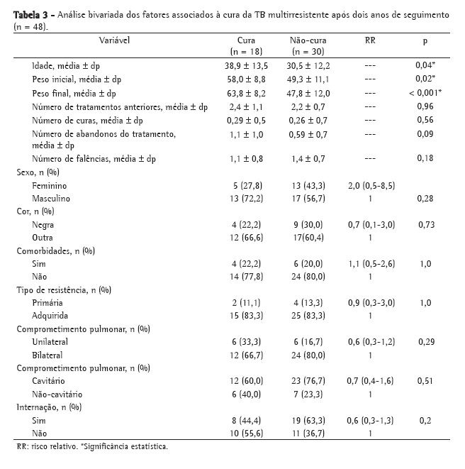 Na Tabela 3, são apresentados os resultados da análise bivariada visando identificar os fatores associados à cura da infecção por TBMR após os primeiros 2 anos de seguimento. Foram excluídos os 2 casos já citados que abandonaram o tratamento. Observou-se que houve diferença estatisticamente significativa entre os pacientes que evoluíram para a cura e os demais no que diz respeito à média de idade (38,9 vs. 30,5 anos, respectivamente; p = 0,04), Houve diferença de peso, estatisticamente significativa na fase inicial do tratamento, para os grupos de cura e não-cura (58,0 vs. 49,0 kg; p = 0,02) e na fase final de cura e não-cura (63,8 vs. 47,8 kg; p < 0,001). Embora as demais variáveis não tenham mostrado diferenças estatisticamente significantes entre os dois grupos analisados, há que se ressaltar que, entre os pacientes que foram curados, houve um menor percentual de comprometimento pulmonar bilateral (66,7% vs. 80,0%) e um menor percentual de doença cavitária (60,0% vs. 76,7%). O comprometimento pulmonar bilateral reduziu em 40% o risco de cura em 2 anos (RR, 1-0,6), enquanto que, para pacientes com padrão radiológico cavitário, esse risco diminuiu em 30% (RR, 1-0,7), conforme mostra a Tabela 3.