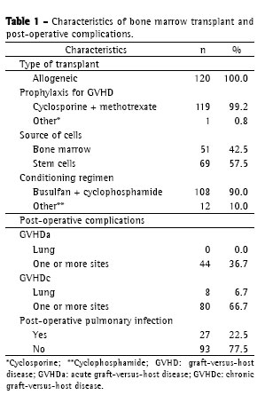 Of the 368 patients whose charts were analyzed, 134 did not undergo the post-transplant spirometry, 95 died before post-transplant day 100 and therefore also were not submitted to a second spirometry test, and 19 were excluded for being younger than 12 years of age at the time of the transplant. Therefore, 120 patients met the inclusion criteria and were included in this study. Of those 120, 52 (43%) were below the age of 30. The distribution of the sample was similar for both genders. The mortality rate was 10%. As to the diagnosis of the underlying disease, 50% suffered from chronic myeloid leukemia. There were 24 patients who were smokers (20%), and 89 were submitted to pre-BMT chemotherapy (74%). Pre-BMT pulmonary infection was observed in three patients (2.5%). In 60 patients (50%), the underlying disease had been diagnosed less than a year prior to the BMT. None of the patients were submitted to TBI.