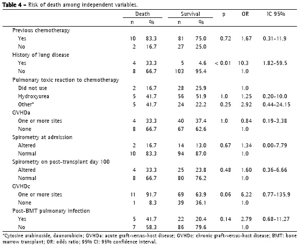 The specific characterization of a history of lung disease can not be defined, since it was not included in the treatment protocol of most patients. The fact that these patients did not present altered spirometry findings can be explained, at least partially, by the absence of measurement of the absolute pulmonary volumes and of the DLCO, which are more sensitive methods for diagnosing pulmonary function alterations. However, a history of lung disease was associated with post-operative mortality. This aspect reinforces the need to thoroughly analyze pulmonary function characteristics in patients who are candidates for BMT, since a significant association between pulmonary problems and higher post-BMT mortality has been reported.(24) In that study, the mortality rate reported for patients with airflow obstruction was 9% in three years, 12% in five years, and 18% in ten years.