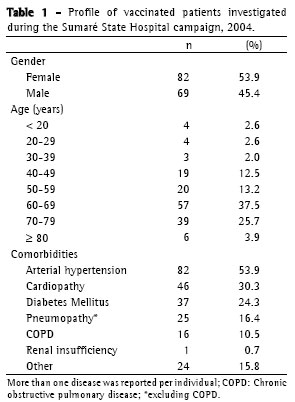Methods In November of 2004, a prospective investigation was conducted, involving 152 individuals who participatedinthevaccinationcampaignagainstpneumococcal diseases (receiving the 23-valent vaccine), diphtheria and tetanus (adult-type combined diphtheria-tetanus vaccine) at the Sumaré State Hospital, a clinical referral center in the microregion of the city of Sumaré (630,000 inhabitants). The campaign lasted two days and had been previously disclosed in public hospitals and medical services throughout the region. General practitioners and specialists working at public hospitals received technical information and literature on the 23-valent vaccine on the occasion of the campaign. The vaccine against diphtheria and tetanus was also offered in order take advantage of the opportunity to administer this vaccine in those who took part in the campaign.