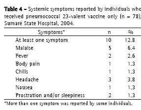 Our finding that systemic complaints after vaccination were reported by 12.8% of the individuals is similar to the 11.3% found in another study(17) involving revaccinated individuals and considerably higher than the approximately 2% reported in yet another study.(14) It is important to emphasize that the systemic symptoms observed in these patients were, for the most part, nonspecific (malaise, sleepiness, and prostration), mild, and reported by individuals of more than 65 years of age with chronic disease. It is possible that the individuals investigated attributed an excessive number of systemic symptoms to the 23-valent vaccine. However, fever, which is a more specific symptom, was reported by 2.6% of the individuals, which is similar to the percentage found by other authors.(17) Nausea has been reported as a possible postvaccination event in other studies.(17)