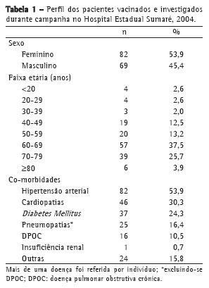 MétodosForam investigados prospectivamente 152 indivíduos que compareceram à campanha de vacinação contra o pneumococo 23-valente e dupla adulto (antitetânica e antidiftérica), no Hospital Estadual Sumaré, referência clínica da microrregião de Sumaré (630.000 habitantes), no mês de novembro de 2004. A campanha durou dois dias e foi divulgada previamente na rede básica de saúde e em serviços médicos dos municípios da microrregião. Foram reforçadas informações técnicas e enviada bibliografia sobre a vacina antipneumocócica para clínicos e especialistas da rede de saúde na ocasião da campanha. Optou-se por ofertar também a vacina contra tétano e difteria, para não se perder a oportunidade de administração dessa vacina na ocasião do comparecimento ao serviço de saúde.