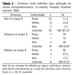 em indivíduos com indicação clínica, em Sumaré (SP) (630.000 habitantes). Métodos: Foram investigados prospectivamente 152 indivíduos após vacinação (0,5 mL intramuscular Pneumo23® Aventis Pasteur, Espanha) em um hospital geral. A variável de estudo foi a queixa de