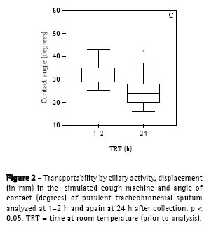 However, the purulent sputum presented alterations not only in ciliary transportability; there was a statistically significant decrease in the contact angle values and an increase in displacement in the simulated cough machine at 24 h after collection (p < 0.005). This indicates a degenerative effect on the structure of the sputum, which was confirmed by the decrease in its consistency. Some authors(17) have associated the liquefaction of sputum stored at room temperature with enzymatic activity. Confirming this precept, other authors(18) observed that alpha-naphthyl acetate esterase, present in the alveolar macrophages of sputum, bronchial secretions and alveolar lavage, still presented some function after 72 h, despite having presented a progressive loss of activity after 24 h at room temperature.