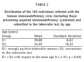 Objective: To evaluate tuberculin test results and relate them to the presence or absence of active tuberculosis, as well as to CD4+ and CD8+ T-lymphocyte counts. Method: The charts of 802 patients with acquired immunodeficiency syndrome treated between August of 1985 and March of 2003 were reviewed. Of the 185 patients submitted to tuberculin tests (23.1%), 107 (57.8%) were male, and 78 (42.2%) were female. Patients were divided into two study groups: tuberculin test reactors (n = 28); and tuberculin test non-reactors (n = 157). Among the reactors, the mean age was 30.60 years, with a standard deviation of 6.62 years, compared with 34.45 years, with a standard deviation of 10.32 years, among the non-reactors. Results: Most of the individuals tested presented only a mild response to the tuberculin test. We found that, at the time of the test, the percentage of individuals with active tuberculosis was greater in the reactor group than in the non-reactor group. During the test period, 10 reactor group patients and 11 non-reactor group patients presented some clinical form of active tuberculosis. In addition, CD4+ T-lymphocyte counts were lower than 200 cells/mm3 in 6 reactor group patients and in 8 non-reactor group patients. Conclusion: Indurations greater than 5 mm were unrelated to higher absolute CD4+ T-cell counts.