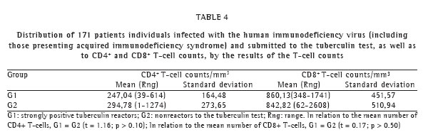 The mean and standard deviation of the CD4+ T-cell counts were equivalent in both groups (t = 1.16; p > 0.10). The same occurred in relation to the CD8+ T-cells (t = 0.17; p > 0.50). For both CD4+ and CD8+ T-cells, the lower limit of the count was always lower among the nonreactors than among the strong reactors (Table 4).