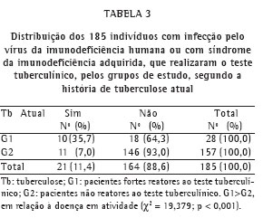 Objetivo: Avaliar os resultados do teste tuberculínico e relacioná-los com a presença ou não de tuberculose em atividade e com a contagem de linfócitos T CD4+/CD8+. Métodos: Foram revisados 802 prontuários de pacientes com síndrome da imunodeficiência adquirida atendidos no período de agosto de 1985 a março de 2003. Cento e oitenta e cinco pacientes realizaram o teste tuberculínico (23,1%) e, destes, 107 eram do sexo masculino (57,8%). A média de idade no grupo de reatores ao teste tuberculínico foi de 30,6 anos, com desvio-padrão de 6,62 anos, e entre os não reatores de 34,45 anos com desvio-padrão de 10,32 anos. Foram constituídos dois grupos de estudo: reatores ao teste tuberculínico, com 28 pacientes, e não reatores ao teste tuberculínico, com 157 pacientes. Resultados: Grande parte dos indivíduos foi pouco responsiva ao teste tuberculínico. Constatou-se, no grupo de reatores, maior porcentagem de indivíduos com tuberculose ativa à época da realização do teste, quando se comparou com os não reatores. Dez pacientes entre os reatores e onze entre os não reatores apresentavam alguma forma clínica de tuberculose em atividade à época da realização do teste, sendo que seis do primeiro grupo e oito do segundo tinham contagem de linfócitos T CD4+ menor que 200 células/mm3. Conclusão: Indurações maiores do que 5 mm não se relacionaram com contagens absolutas mais altas de células T CD4+.