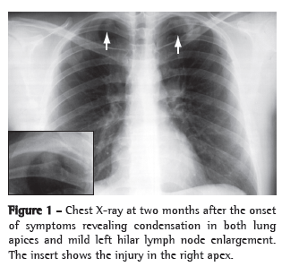Case reportA 28-year-old white male, who was a physician and a resident of the city of Ribeirão Preto, Brazil, presented with a three-month history of daily fever (37.5-38.5°C). He also presented with intense nonproductive cough, chest pain in the right subscapular region, loss of appetite and malaise. The patient received a nonsteroidal anti-inflammatory drug for 10 days, and the symptoms were attenuated. With the discontinuation of the drug, the fever returned, together with headache, malaise and productive cough with yellow expectoration. The patient received amoxicillin/clavulanate, and the expectoration decreased. However, he had dry cough, loss of appetite, prostration, weakness, night sweats and irregular fever, all of which had intensified within the last few days. In addition, he had lost approximately 4 kg of body weight.