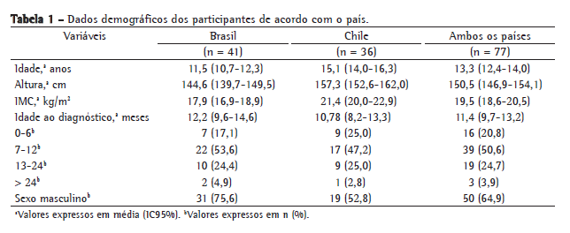 Os dados demográficos são mostrados na Tabela 1. Em ambos os grupos, houve predominância do sexo masculino (Brasil: 75,6%; Chile: 52,8%). As médias gerais (e as médias de grupo para Brasil e Chile, respectivamente) foram as seguintes: idade, 13,3 anos (11,5 e 15,1 anos); altura, 150,5 cm (144,6 e 157,3 cm); e IMC, 19,5 kg/m2 (17,9 e 21,4 kg/m2). O início da doença ocorreu entre 1 e 24 meses de idade na maioria dos pacientes (97% do grupo do Brasil e 97% do grupo do Chile).