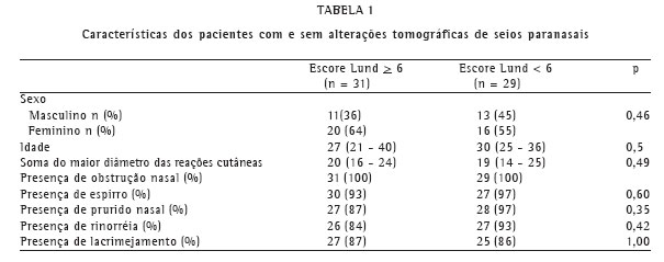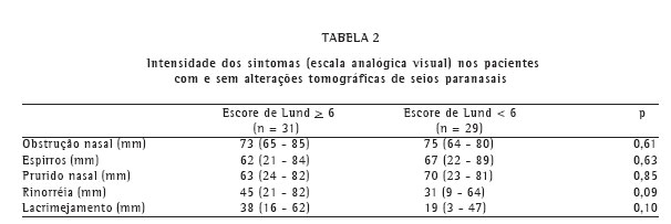 Alteração tomográfica de seios paranasais (escore de Lund > 6) ocorreu em 31 pacientes (52%). Na Tabela 1 observa-se que os pacientes com escore de Lund > 6 tinham idade, sexo e soma do maior diâmetro das reações cutâneas semelhantes aos dos pacientes com escore < 6. Não houve diferença entre os grupos na intensidade dos sintomas avaliada por meio da escala visual analógica (Tabela 2).