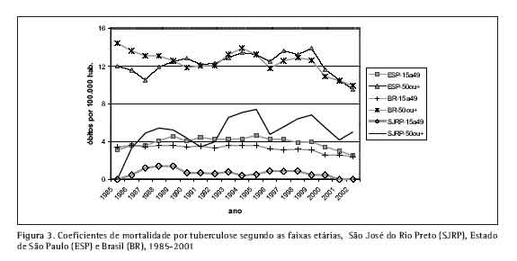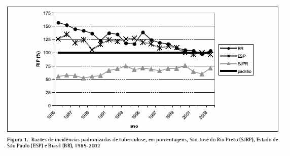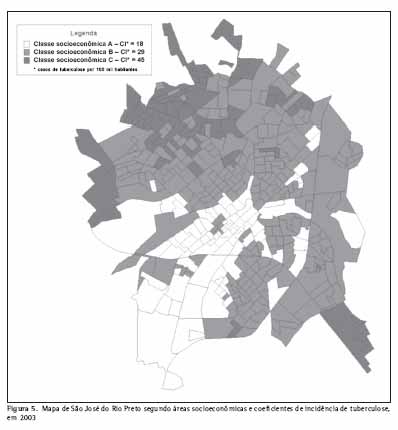 Assim, é importante realizar estudos para melhor conhecer as condições de ocorrência deste agravo no município como um todo, bem como segundo suas diferentes áreas. Os objetivos deste trabalho foram analisar os indicadores de morbidade e mortalidade por tuberculose (TB) em São José do Rio Preto, entre 1985 e 2003, compará-los com valores do Estado de São Paulo e do Brasil, e avaliar a relação entre o risco de ocorrência da doença e os níveis socioeconômicos.