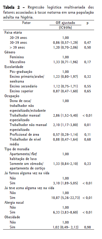 Objetivo: Determinar os fatores associados à tosse seca, tosse produtiva e tosse noturna entre jovens adultos na Nigéria. Métodos: Foram avaliados 498 indivíduos com 20-44 anos de idade em Ilorin, Nigéria, utilizando-se o questionário European Community Respiratory Health Survey (ECRHS), administrado por entrevistadores treinados. Resultados: A tosse noturna apresentou associações com asma (OR = 10,87; p < 0,01), alergia nasal (OR = 6,33; p < 0,01), tabagismo (OR = 3,10; p < 0,01), trabalho manual e trabalho não manual especializados (OR = 2,86 e 2,10, respectivamente; p < 0,01 para ambos) e gênero feminino (OR = 1,33; p = 0,17). A tosse produtiva apresentou associações com trabalho manual e trabalho não manual especializados (OR = 3,82 e 3,03, respectivamente; p < 0,01 para ambos), tabagismo (OR = 3,10; p < 0,01), asma (OR = 3,27; p < 0,01) e alergia nasal (OR = 5,81; p < 0,01). A tosse seca apresentou associações com asma (OR =5,18; p < 0,01) obesidade (OR =1,88; p = 0,19), tabagismo (OR = 1,77; p = 1,44), alergia nasal (OR = 1,45; p = 0,26) e gênero feminino (OR =1,36; p = 0,33). A idade, o gênero, o tipo de residência e a obesidade não se associaram significativamente a nenhum tipo de tosse (p > 0,05). Conclusões: A prevenção precoce e o tratamento de condições associadas à tosse, assim como a modificação de fatores sociais comumente associados à tosse, são necessários a fim de reduzir a morbidade respiratória.