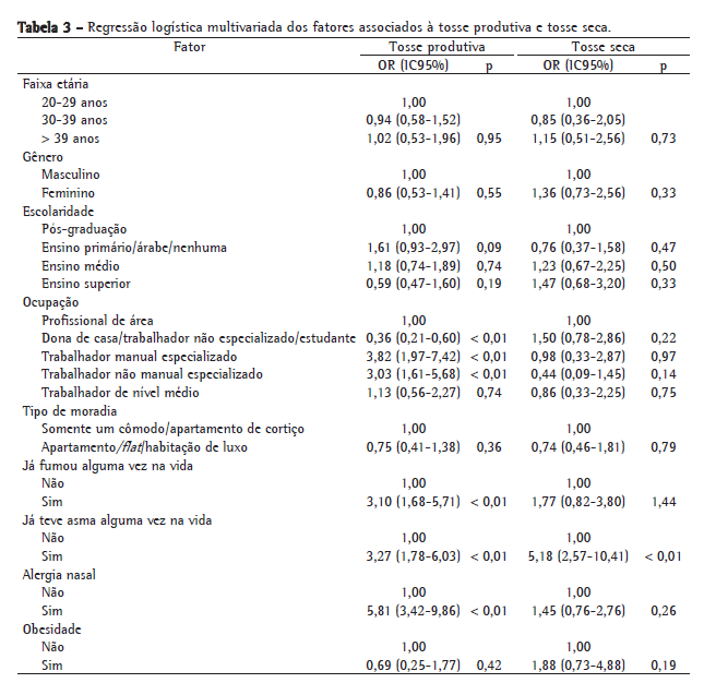 Os dados foram analisados pelo Statistical Package for the Social Sciences, versão 15 (SPSS Inc., Chicago, IL, EUA). Para determinar as características da população do estudo, estatísticas descritivas e de frequência foram geradas. O teste do qui-quadrado foi utilizado para testar a significância estatística, e valores de p < 0,05 foram aceitos como estatisticamente significativos. Para determinar os fatores associados à tosse seca, tosse produtiva e tosse noturna, foi realizada análise multivariada por regressão logística. As ORs foram ajustadas para idade, gênero, ocupação (Anexo I), escolaridade, tipo de moradia, tabagismo, asma e alergia nasal.