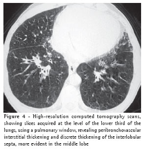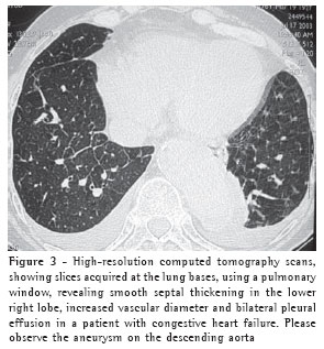 On high-resolution computed tomography scans, increased diameter of arteries and veins can be seen, facilitating their recognition in the perihilar regions, in which arterial diameter is usually similar to that of the respective bronchi.(3,9)