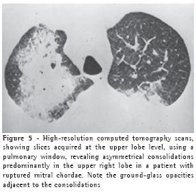 Consolidation was detected in only five (33%) of the patients (Figures 2 and 5). All of the patients presented bilateral consolidations, In two cases, the distribution was asymmetric, with a 'bat-wing' aspect, and predominant in the upper right lobe (cases of mitral valve chordae rupture) (Figure 5).