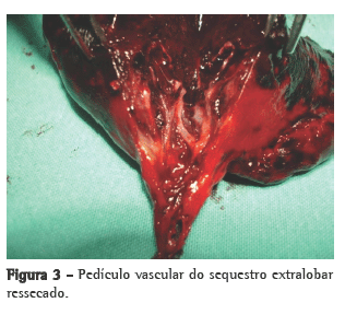 Os achados sugeriam fortemente a presença de um sequestro com torção e ruptura parcial do pedículo vascular e infarto do segmento pulmonar extralobar. A ressecção da lesão foi alcançada após a ligadura do pedículo vascular oriundo da artéria e veia intercostais. O segmento da veia intercostal anômala mostrava evidências de ruptura e colapso prévios (Figura 3), o que poderia explicar o sangramento. A cavidade pleural foi drenada com dreno tubular de calibre 28 French, retirado no segundo dia de pós-operatório.