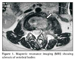 As her condition worsened, leading to difficulty in moving about, she was advised to seek medical assistance at a neurosurgery outpatient clinic, where she was submitted to lumbosacral spine computed tomography, magnetic resonance imaging, chest X-ray, biopsy of the affected site and blood count (including determination of erythrocyte sedimentation rate). Computed tomography revealed irregularity and reduction of the articular space between L2 and L3, concomitant with sclerosis of the corresponding vertebral bodies, as well as fracture in L2. The vertebral disk between L5 and S1 presented a slight protrusion, without causing significant intrarachidian repercussions. The findings suggested the possibility of an inflammatory or infectious process, or both, involving the L2 and L3 vertebral bodies, as well as the corresponding intersomatic disk (Figure 1). Magnetic resonance revealed reduction of the L2/L3 disk space and cold abscess in the corresponding area, which reinforced the possibility of a spondylodiscitis-like process (Figures 2 and 3).
