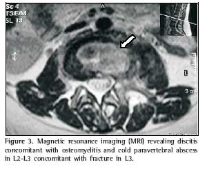 Various studies have shown that tuberculous spondylitis may involve the lower portion of the spinal column and the lumbosacral junction. In 1991, Mansberg reported the case of an L5 fracture concomitant with L5/S1 intervertebral disk herniation, caused by M. tuberculosis infection in the body of L5 vertebra(11).