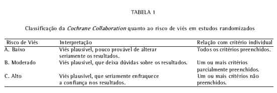 O risco de viés de um estudo está diretamente relacionado aos critérios previamente definidos. Na Tabela 1 está a classificação, segundo o manual da Cochrane, quanto ao risco de viés de um estudo randomizado(15).