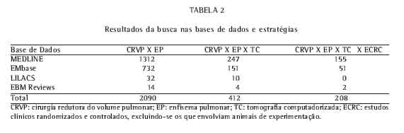 A estratégia de busca seguiu a metodologia que envolve três etapas(10): inclusão de termos relacionados à condição (enfisema pulmonar x CRVP); inserção de termos relacionados à intervenção (tomografia computadorizada); e inclusão de termos relacionados à metodologia dos estudos clínicos(11). A observância desses passos conferiu aumento de sensibilidade a esta revisão. A cada etapa, foram excluídos os estudos que envolviam animais de experimentação. As referências bibliográficas dos estudos também foram analisadas, procurando-se identificar artigos que porventura tivessem escapado às bases de dados. Também foi realizada uma busca manual de artigos em revistas não indexadas e mantido contato com especialistas quanto a eventuais estudos não publicados.