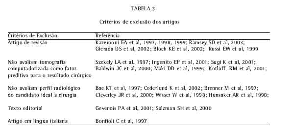 Dois revisores independentes fizeram a seleção final dos artigos e a análise individual de cada um deles. Informações, tais como dados demográficos, tamanho da amostra, características do estudo, metodologia, intervenções, resultados e seguimento, foram extraídas de todos os artigos selecionados. Em caso de discordância, os artigos eram revisados, visando a uma posição consensual, e, na sua ausência, recorrer-se-ia a um terceiro revisor.