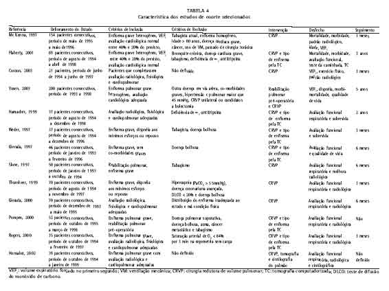 Os critérios de inclusão de artigos para esta revisão sistemática foram: estudos de pacientes portadores de enfisema pulmonar avançado, submetidos à CRVP, independentemente da via de acesso, publicados no período de janeiro de 1994 e janeiro de 2004; estudos que dissertassem sobre o valor prognóstico da avaliação radiológica (radiogramas e/ou tomografia computadorizada do tórax) no candidato a CRVP, realizada no pré e no pós-operatório; artigos que correlacionassem os achados funcionais e radiológicos ao desfecho cirúrgico; estudos que contivessem seguimento pós-operatório com avaliação radiológica e funcional; estudos que mensurassem a morbidade, mortalidade e a qualidade de vida, após a CRVP; estudos randomizados e observacionais. Foram considerados os estudos em língua inglesa, portuguesa e espanhola.