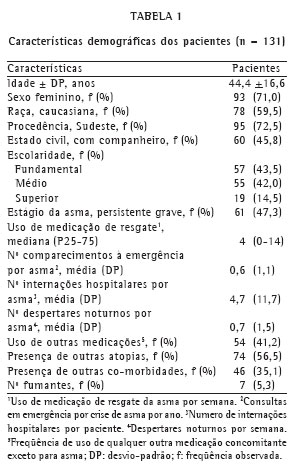 As variáveis estudadas foram idade, sexo, raça, estado civil (considerado aqui apenas como com ou sem companheiro fixo), escolaridade (ensino fundamental, médio ou superior), tabagismo (atual, ex-fumantes ou nunca fumantes), características de gravidade da asma (estágio, confirmação de uso de medicação de resgate e de despertares noturnos), freqüência de comparecimento à emergência e de existência de internações hospitalares por asma, e presença de outras atopias e de co-morbidades, além de uso crônico de outras medicações (que não para tratamento da asma) .