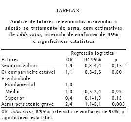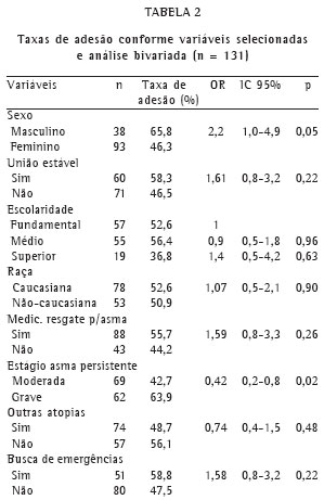 Na análise bivariada, sexo masculino foi fator de proteção para adesão em relação ao feminino (odds ratio 2,2; intervalo de confiança de 95%: 1,0 - 4,9; p = 0,05), não confirmado, entretanto, na análise multivariada. Houve maior adesão, com significância estatística, nos asmáticos que se encontravam no estágio persistente grave em relação aos persistentes moderados, isto é, quanto mais grave a asma, maior foi a taxa de adesão observada, tanto na análise bivariada como na regressão logística (odds ratio 0,4; intervalo de confiança de 95%: 0,2 - 0,8; p = 0,02 e odds ratio 2,4; intervalo de confiança de 95%: 1,1 - 5,1; p = 0,03, respectivamente).
