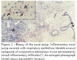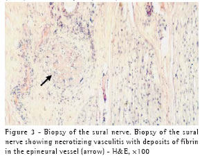 After her admittance to the Clementino Fraga Filho University Hospital, she complained of leg cramps, followed by progressive and serrated paresthesia in her arms and legs, constituting a clinical profile consistent with multiple mononeuritis. The complementary exams revealed the following: 25% eosinophils (2300/mm3); high erythrocyte sedimentation rate (63 mm/h); platelet count, 540,000/mm3; immunoglobulin E, 166 U; 25.8% globulin (1.7 g). Immediate skin tests with inhaled antigens, including Aspergillus fumigatu, were negative. The baseline spirometry results were normal. The methacholine bronchoprovocation test was not performed, since there had already been a significant drop in forced expiratory volume in one second after inhalation of saline solution, which is compatible with important bronchial hyperresponsiveness. The biopsy of the sural nerve revealed severe axonal neuropathy, with necrotizing vasculitis but without granulomas (Figure 1). The patient then developed chronic sinus disease (Figure 2) and nasal polyposis (Figure 3). She had not had asthma or rhinitis during her childhood and adolescence, although there was a family history of atopia.The combination of asthma, rhinosinusitis, nasal polyposis, eosinophilia and vasculitis met the criteria for CSS.