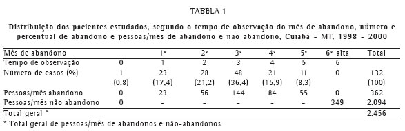 DISCUSSÃOA incidência global de abandono foi de 5,1 abandonos por 100 pessoas/mês. Isto equivale a 27,3% de abandono entre todos aqueles que fizeram tratamento nos anos de 1998, 1999 e 2000, resultado concordante com outros estudos, cujos percentuais encontrados variam entre 6,8% e 33,8%.(5,11-12) No entanto, para o município de Cuiabá,(1) segundo avaliação realizada através dos dados do Sistema de Informação de Agravos de Notificação, os abandonos de casos bacilíferos foram menores (maiores de quinze anos), representando 16,1%, com declínio acentuado em 1999 e 2000 (7,7% e 4,9%, respectivamente).