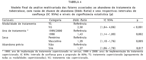 Encontram-se na Tabela 4 as variáveis mais importantes como preditoras da presença de abandono (variável de desfecho), com o uso da regressão logística múltipla: modalidade de tratamento não supervisionado/supervisionado (razão de chance de 2,58; intervalo de confiança 95%: 1,64 - 4,06; p < 0,001); seguida do ano de realização do tratamento - 1998/1999 e 2000 (razão de chance de 1,43; intervalo de confiança 95%: 1,14 - 1,80; p = 0,002); sexo - masculino/feminino (razão de chance de 1,39; intervalo de confiança 95%: 1,10 - 1,76; p = 0,005); e, por último, aqueles pacientes com história de abandono prévio do tratamento da tuberculose (razão de chance de 1,37; intervalo de confiança 95%: 1,06 - 1,78; p = 0,017).