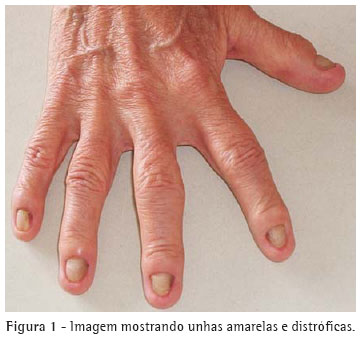 Ao exame físico, tinha todas as unhas das mãos (Figura 1) e dos pés com coloração amarelada, com áreas de escurecimento discreto, com aumento da curvatura longitudinal e transversa, perda da cutícula e lúnula, onicólise e estrias transversais de hiperceratose. Apresentava edema não compressível de membros inferiores, mais intenso na perna esquerda, com eritema leve nesta perna (Figura 2). À ausculta pulmonar apresentava roncos difusos, sibilos esparsos e crepitações no terço médio do hemitórax direito, além de diminuição do frêmito tóraco-vocal e atrito pleural na base direita. Os demais sistemas apresentavam-se sem alterações.