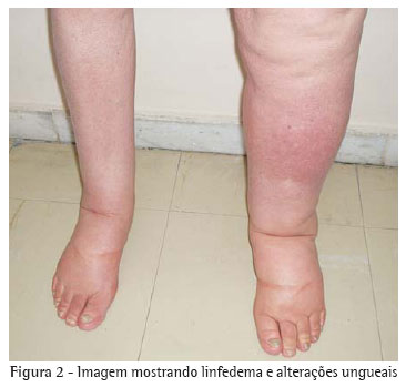 Relatava apresentar alterações ungueais, e que edema de membros inferiores estava presente desde a adolescência.