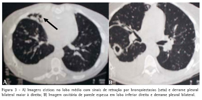 Trouxe consigo os seguintes exames: ultra-som abdominal, com leve hepatomegalia inespecífica, derrame pleural bilateral e microlitíase em vesícula biliar; e tomografia computadorizada do tórax, que apresentava derrame pleural bilateral, dilatações brônquicas císticas no lobo médio e presença de imagem cavitária no segmento apical do lobo inferior direito (Figuras 3A e 3B).