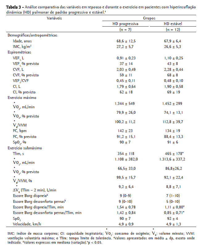 As seguintes variáveis foram medidas (respiração a respiração) e expressas como média de tempo de 15 s em valores absolutos e em percentagem do previsto(22): captação pulmonar de oxigênio (O2), em mL/min, em condições standard temperature, pressure dry (STPD); liberação pulmonar de dióxido de carbono, em mL/min, em STPD; ventilação minuto em condições body temperature, pressure saturated; volume corrente; e FR. O limiar de troca gasosa foi avaliado pelo método V-slope.(23) A FC foi determinada utilizando-se o intervalo RR de um eletrocardiograma de 12 derivações, e a SpO2 foi estimada por oximetria de pulso com um aparelho de modelo Onyx 9500T (Nonin, Plymouth, MN, EUA). As modificações dinâmicas nos volumes pulmonares operantes foram avaliadas com medidas seriadas da CI, assumindo-se que a CPT permanecia constante durante o exercício.(5) A validade, a reprodutibilidade e a sensibilidade a intervenções desse procedimento já foram amplamente demonstradas em pacientes com DPOC.(6-10) Foram realizadas duas manobras em repouso, ao final do período inicial, e a cada 2 min após o início da velocidade constante, objetivando-se obter valores reprodutíveis (diferença menor que 10% do maior valor, em cada estágio). A HD foi definida como qualquer queda da CI em relação aos valores iniciais de repouso.(24)