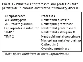 Primarily synthesized in the liver, 1-antitrypsin is a 52-kDa glycoprotein. It consists of a polypeptide chain of 394 amino acids and can inhibit the proteolytic activity of neutrophil elastase and other proteinases. In 1963, some authors(27) proposed an association between 1-antitrypsin serum deficiency and emphysema, originating a theory that an imbalance between proteinases and antiproteinases sparks the genesis of COPD. Its genetic deficiency results in pulmonary emphysema in young nonsmokers (Chart 1).