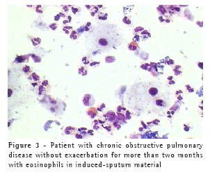 Eosinophils constitute one of the cells directly related to asthma. In COPD, some studies have identified eosinophils in exacerbations, as well as in the phases of stability of the disease, through biopsies, bronchoalveolar lavage and sputum analysis.(17-18) Initially, it was believed that eosinophils were present only in a subtype of COPD, with clinicar behavior similar to asthma. However, various studies have identified eosinophils in COPD exacerbation (Figure 3).