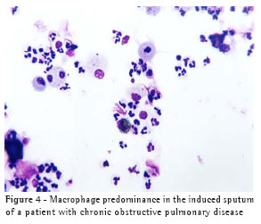Macrophages play an important role in the development of COPD and are found to be in increased numbers in the bronchial wall as well as in the lung parenchyma, especially in the alveolar spaces, in patients with COPD. Macrophages are cells derived from the bone marrow and the blood monocyte. They constitute the most common cell type among those that reside in the lung. They have various functions: they phagocyte particles or antigens; participate in the presentation of antigens to T lymphocytes; and can release various cytokines and active metabolites of arachidonic acid. They present significant pleomorphism in the lung, and different sizes. The smaller ones present intense phagocytosis capacity, and the larger ones exhibit great biochemical activity.(20-21)