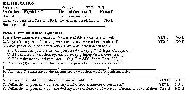 A team was formed consisting of five interviewers, all of them experienced in the use of NIV. In the hospitals visited, the interviewer delivered the questionnaire described below, which was then completed at the convenience of the staff member (so as to avoid interfering with the responses). The interviewer later made a follow-up visit in order to answer any questions. The questionnaire was created for the purposes of this study and consisted of two parts. The first part was aimed at characterizing the professional, whereas the second dealt with availability of the equipment, as well as the level of expertise, currency of knowledge and familiarity with NIV possessed by that professional. There were a total of eight questions. (Annex 1)