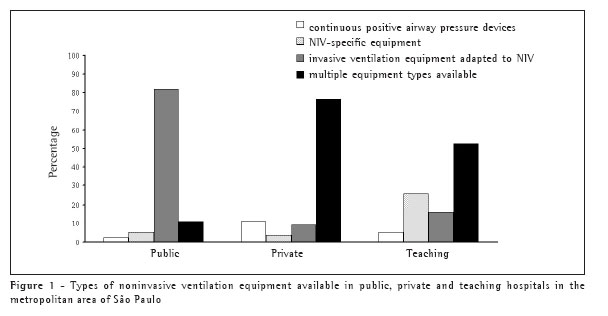 Objective: To determine the availability of noninvasive positive-pressure ventilation equipment, as well as the level of expertise and familiarity of physicians, nurses and physiotherapists with noninvasive positive-pressure ventilation in the intensive care units of public, private and teaching hospitals in the greater metropolitan area of São Paulo, Brazil. Methods: On-site administration of questionnaires. Results: Noninvasive positive-pressure ventilation equipment was widely available and was more commonly found in private hospitals than in teaching hospitals. Such equipment was least available in public hospitals, in which the predominant method was the use of mechanical ventilators designed for invasive ventilation and adapted to noninvasive positive-pressure ventilation. In private hospitals, continuous flow ventilators were more common, whereas, in teaching hospitals, ventilators specifically designed for noninvasive ventilation were typically employed. All physiotherapists felt themselves capable of initiating noninvasive positive pressure ventilation, compared with 72.6% of physicians and 33.3% of nurses. Physicians and physiotherapists presented high percentages of correct answers when asked about the indications and contraindications for the use of noninvasive positive-pressure ventilation. Over a one year period, more physiotherapists read articles about noninvasive positive-pressure ventilation and participated in related classes than did physicians, who in turn did so more than did nurses. Conclusion: Noninvasive positive-pressure ventilation equipment is widely available in the greater metropolitan area of São Paulo, although differences exist among public, private and teaching hospitals in terms of the type of equipment used. Physicians and physiotherapists exhibited considerable knowledge regarding the indications and contraindications for the use of noninvasive positive-pressure ventilation. More physiotherapists felt themselves able to initiate noninvasive positive-pressure ventilation, and their knowledge of the subject was more current than was that of physicians or nurses.