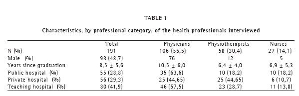 RESULTtS A total of 15 hospitals were visited, 5 public hospitals, 5 private hospitals and 5 teaching hospitals. In this last category, 3 were affiliated with a medical school, and 2 offered comprehensive residency and graduate studies programs. We interviewed 191 health professionals who worked in these 15 hospitals. The principal characteristics of the interviewees can be found in Table 1. Of the physicians interviewed, there were 41 intensivists (38.7%), 23 cardiologists (21.7%), 14 pulmonologists (13.2%), 8 general practitioners (7.5%), 5 nephrologists (4.7%) and 15 practitioners of other specialties (14.2%). Only 45 physicians held the title of specialist in intensive medicine (42.5%), of which 13 worked at public hospitals (37.1%), 12 worked at private hospitals (48%) and 20 worked at teaching hospitals (43.5%) (p = 0.47).